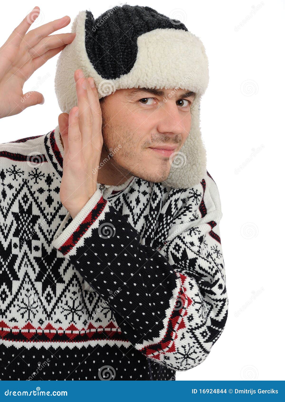 Funny Winter Man In Warm Hat And Clothes Listening Stock Photo – Image …