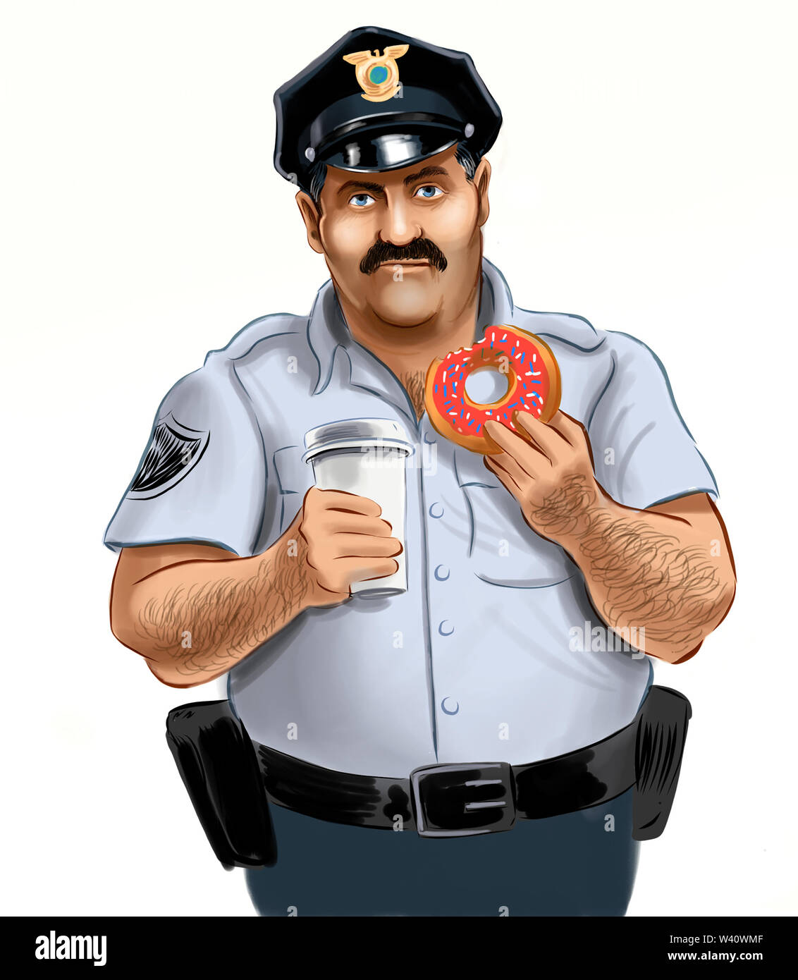 Fat American cop eating a doughnut and drinking a coffee. Digital …